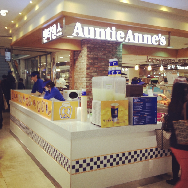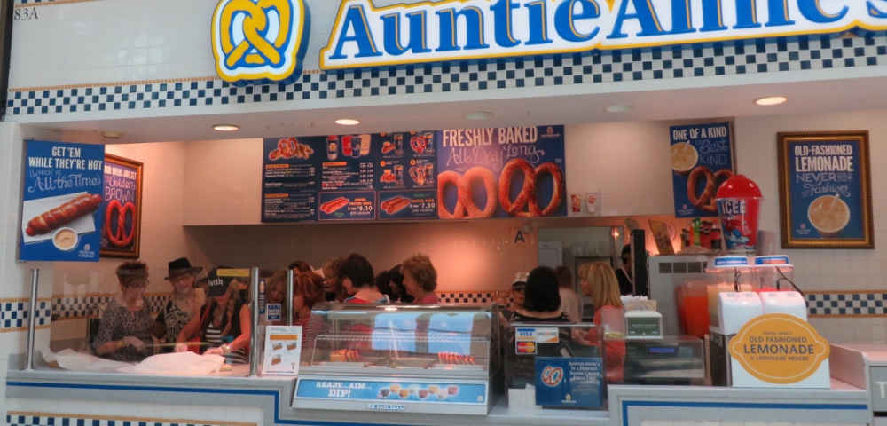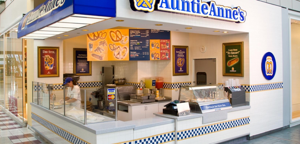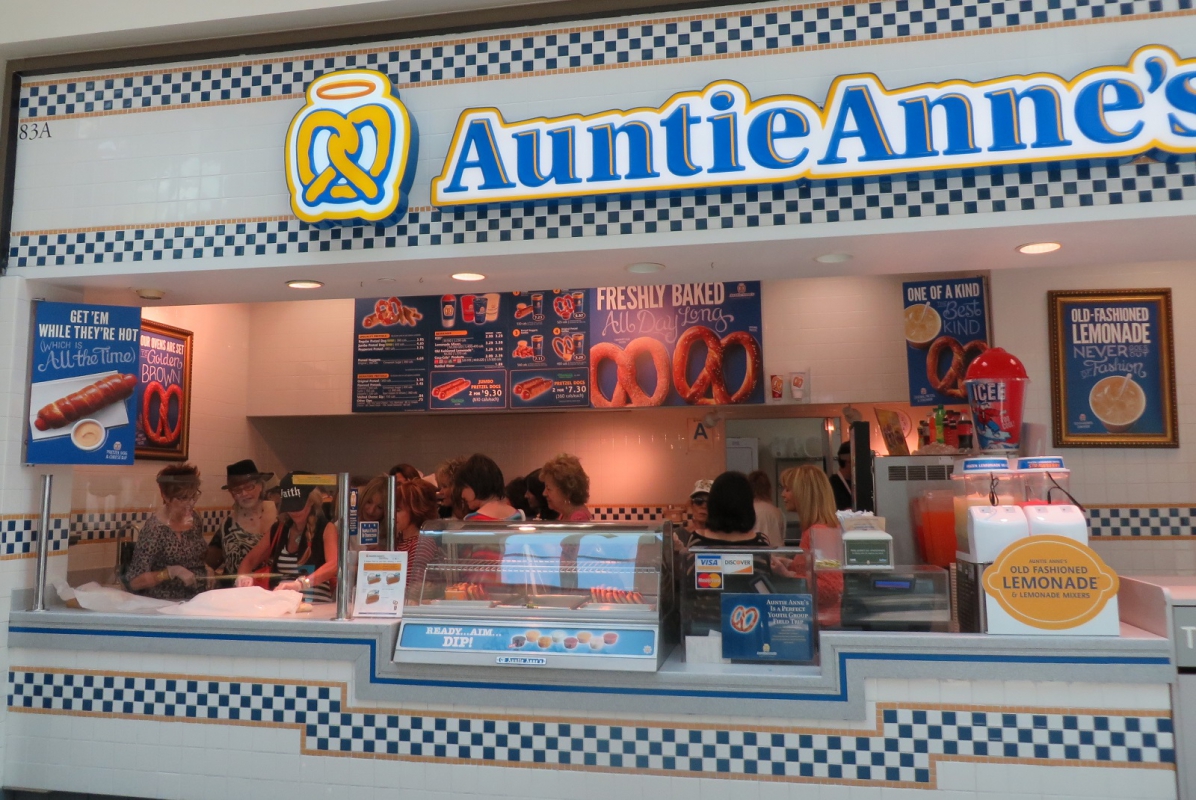 Auntie Anne's, based in Lancaster, Pennsylvania, is an American chain of pretzel shoppes founded by Anne Beiler and her husband, Jonas, in 1988. Auntie Anne's serves products such as pretzels, dips, and beverages. They also offer Pretzels & More Homemade Baking Mix. The chain has more than 1,500 locations around the world, in malls, outlet centers, and Walmarts, as well as non-traditional spaces including universities, airports, travel plazas, amusement parks, and military bases.