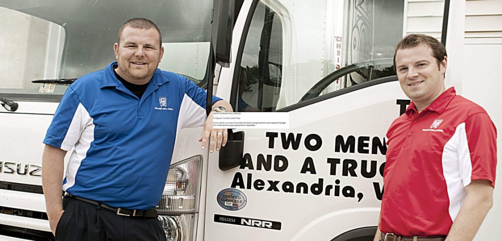 The company was founded in the early 1980s by Lansing brothers Brig Sorber and Jon Sorber. Using an old pickup truck, they performed moves to earn extra money. Their mother, Mary Ellen Sheets, drew the logo for their new company. That stick-figure logo still represents Two Men and a Truck today. Two Men and a Truck's boxes can be seen in the moving scenes of the 2014 movie Earth to Echo, the 2012 movie Save the Date. the opening scene of the 2011 movie Limitless, in scenes from the 2007 movie No Reservations, and both boxes and a truck with the logos plainly visible appeared in the 2005 movie White Noise as well as boxes with logos in the 2008 movie Burn After Reading.